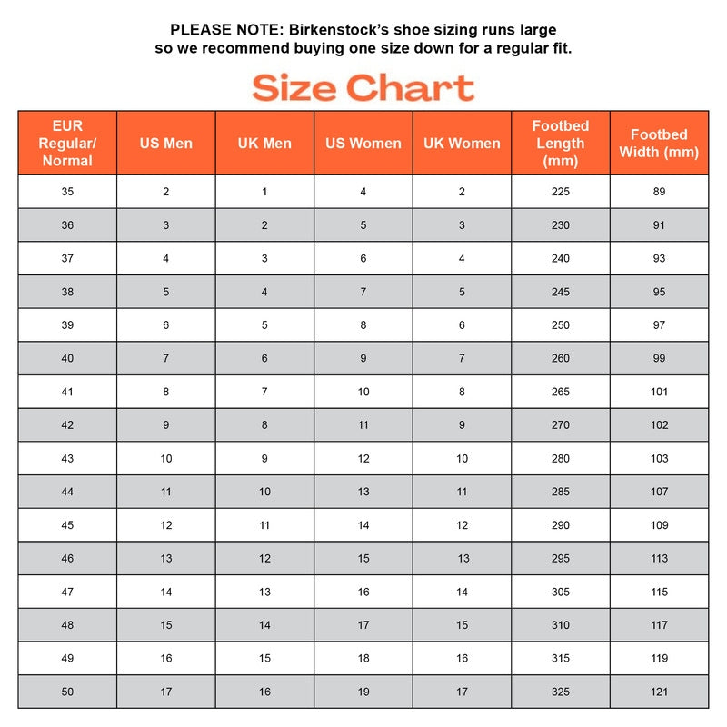 Please Note: Birkenstock sandals tend to run slightly large. For the best fit, we recommend selecting one size down from your regular size.
